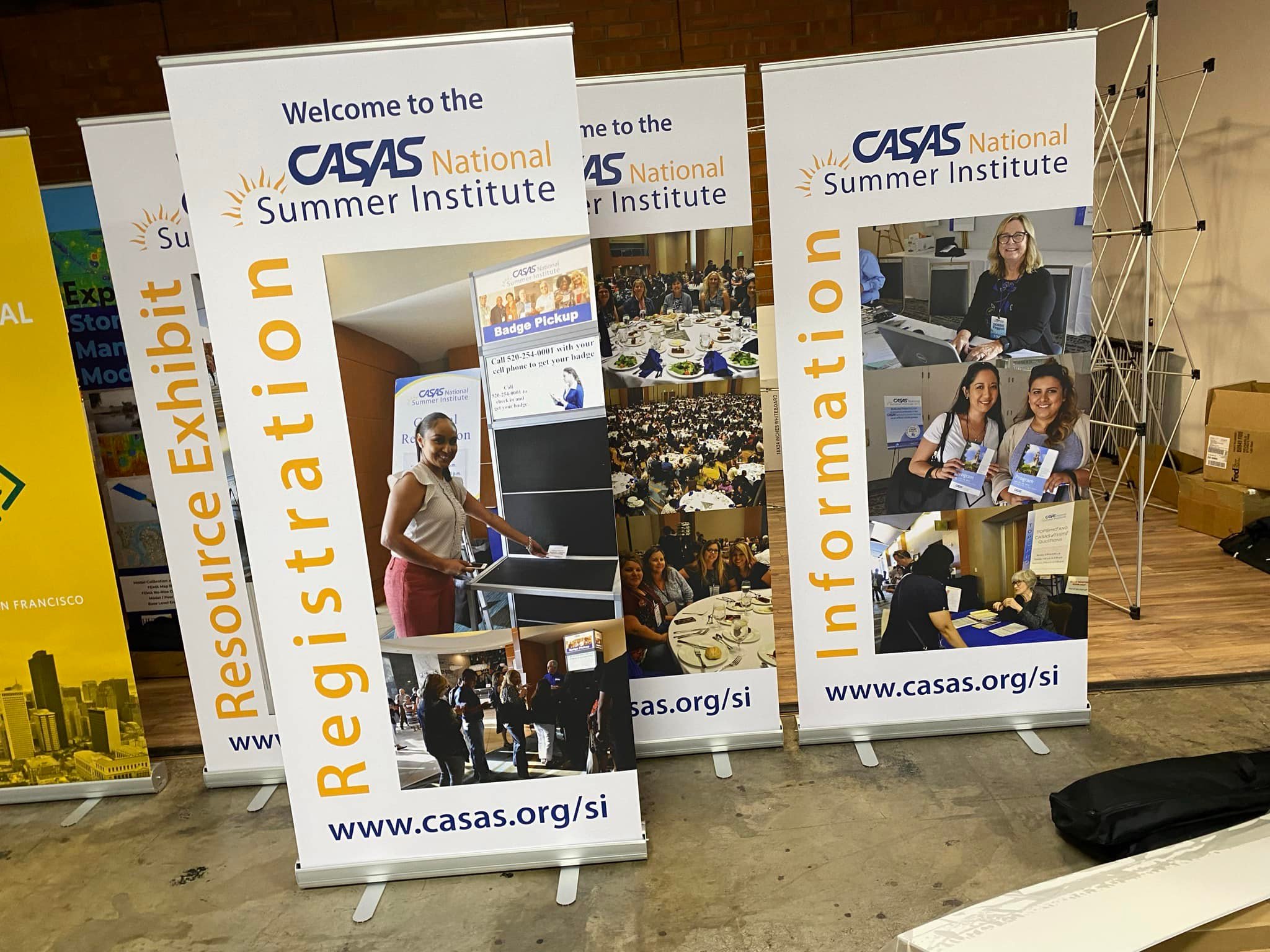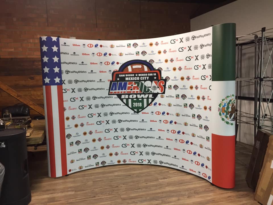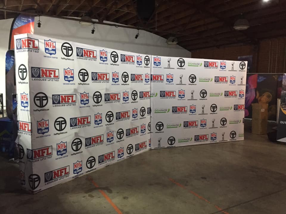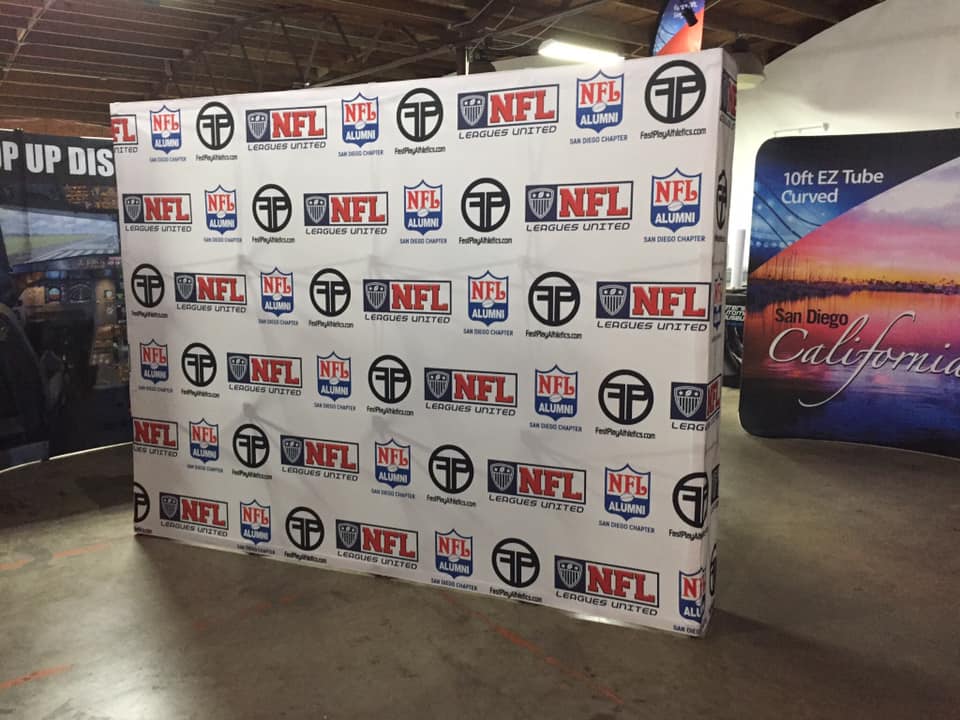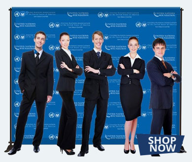 Step-and-Repeat Backdrop Banner is a backdrop display that has one or more sponsor logos repeated in a step pattern.